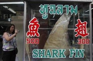 A woman takes a photograph of a dried shark fin on display at a restaurant in Bangkok March 5, 2013. The Convention on International Trade in Endangered Species of Wild Fauna and Flora (CITES) will be held from March 3 till March 14 in Bangkok. PEW, an international NGO, said 143 species of sharks are facing extinction unless there is a control on the shark-fin trade. It is calling to CITES country members to put sharks on the controlled trade list. REUTERS/Chaiwat Subprasom