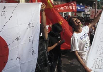 An anti-Japan protester chants slogans beside a defaced Japanese flag, with Chinese characters reading “Blood can be shed” ,in the southern Chinese city of Guangzhou September 18, 2012. REUTERS/James Pomfret